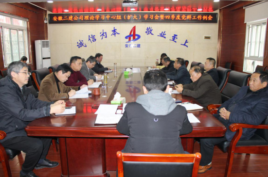 12月11日下午,安徽二建公司召開黨委理論學(xué)習(xí)中心組(擴(kuò)大)暨四季度黨群工作會(huì),公司領(lǐng)導(dǎo)班子、黨委工作部、紀(jì)檢監(jiān)察室、工會(huì)、團(tuán)委、信訪保衛(wèi)部、人力資源部主要負(fù)責(zé)人,所屬各黨支部書記參加。會(huì)議由黨委副書記、紀(jì)委書記仇多維主持。